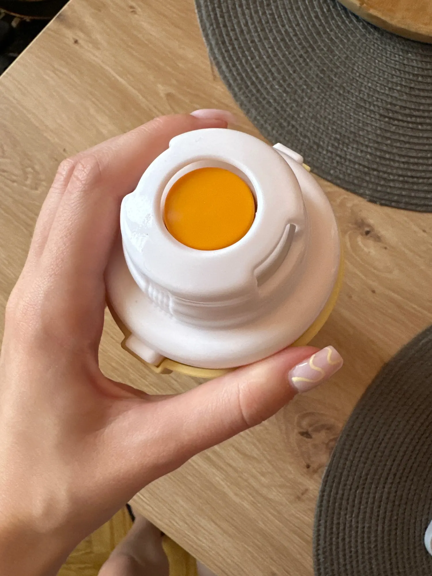 Cat drinking from a white bowl held by a person on a light gray background
